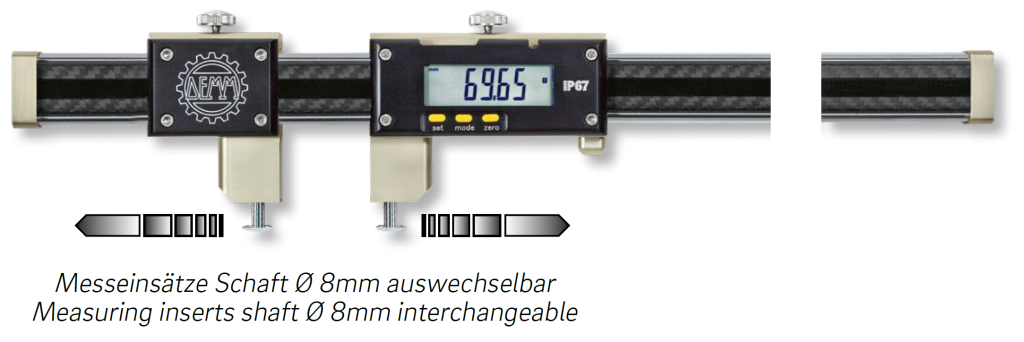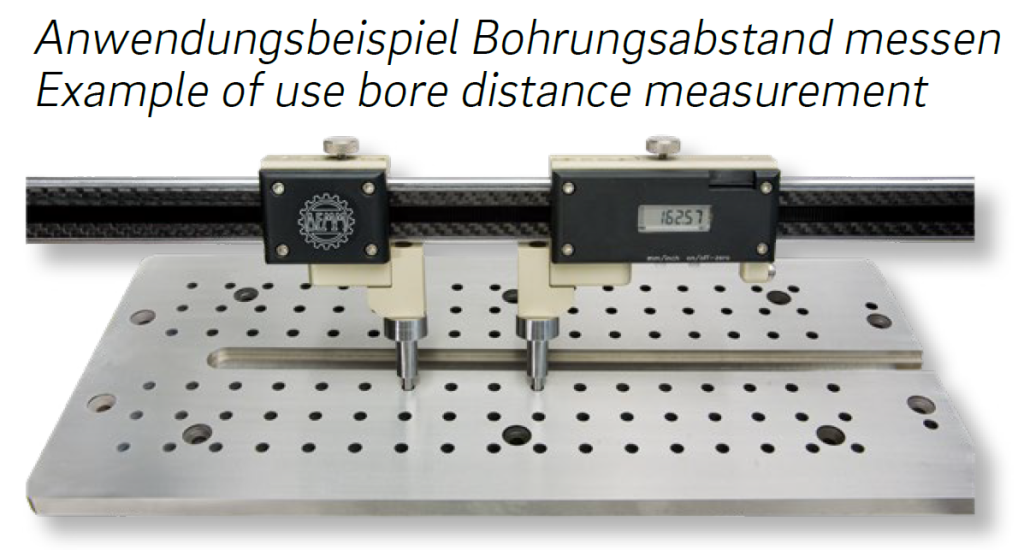 - Durch verschiedene Messtaster (Zubehör) können vielfältige Messaufgaben realisiert werden. z.B. Innen- Außenmessung, Messen von Bohrungsabständen, Nuten und Absätzen.