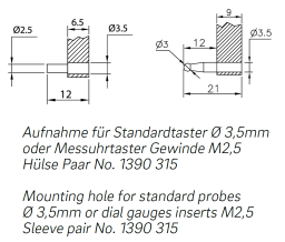 Lieferung im Etui inklusive 1 Paar Hülsen Ø 3,5mm mit Innengewinde M 2,5 und Messeinsätzen mit Kugel Ø 3mm
