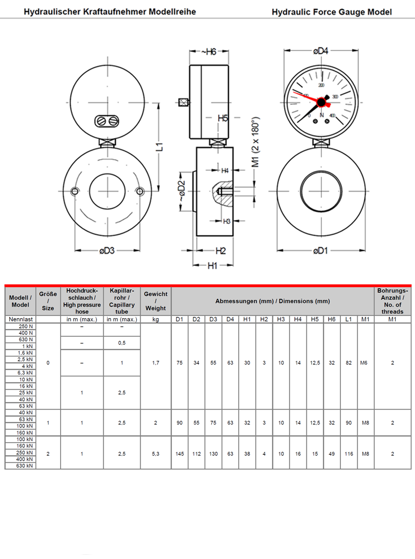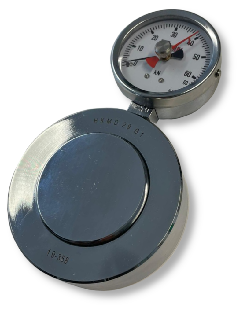 Kraftmessdosen für Druckkraftmessung mit Schleppzeiger, inklusive Kalibrierschein