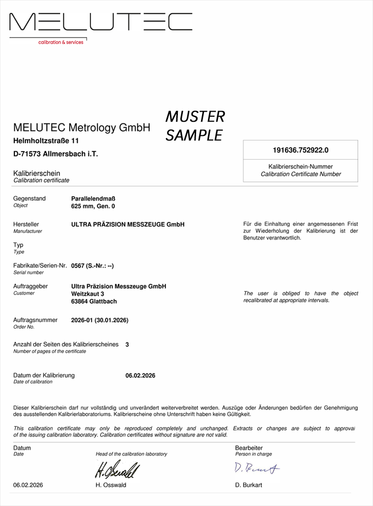Lieferung bis Nennmaß 500,000mm inkl. DAkkS-Kalibrierschein, > 500,000mm inkl. Werks-Kalibrierschein, > Nennmaß 100,000mm im Etui