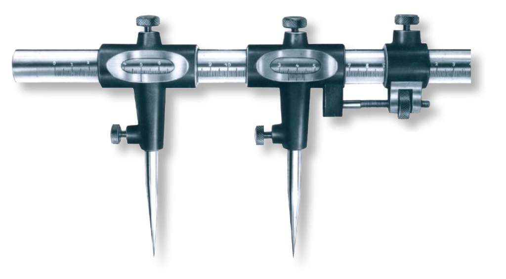 Stangenzirkel, runde Stange aus Stahlrohr DIN 866/B mit Feineinstellung, mit auswechselbaren Spitzen