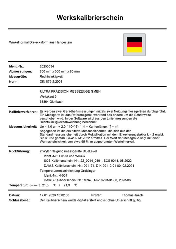 Winkelnormale 90° Dreieckform, aus Naturhartgestein DIN 875 / 876 - Güte 00, inkl. Kalibrierschein u. Verpackung