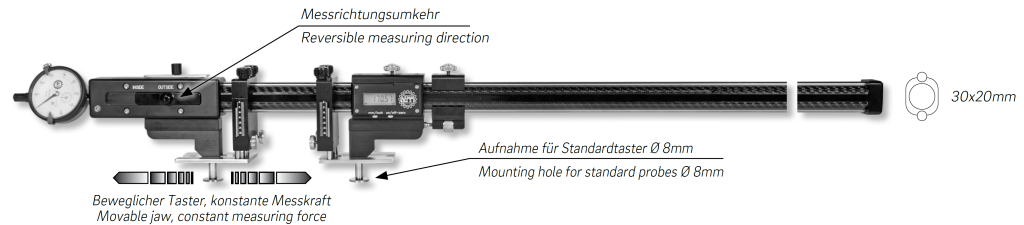 - Inside and outside measurements, with special measuring inserts also in slots and recesses