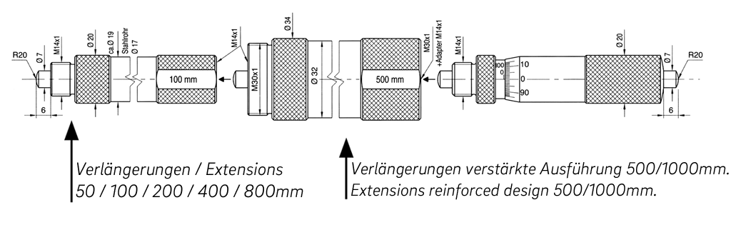 Internal micrometer sets in box, spring-loaded extensions spherical tungsten carbide meas. faces Ø 7x6mm, pitch 0,5mm