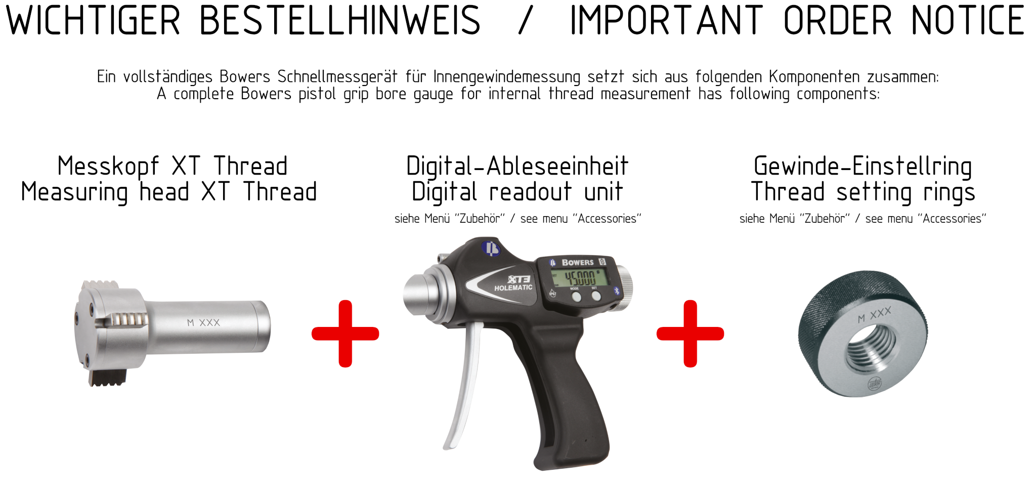 IMPORTANT ORDER NOTICE - A complete BOWERS pistol grip bore gauge for internal thread measurement consists of the following components: