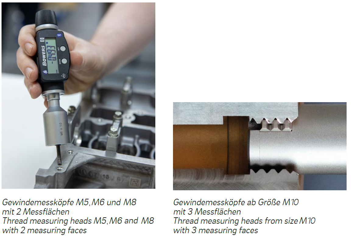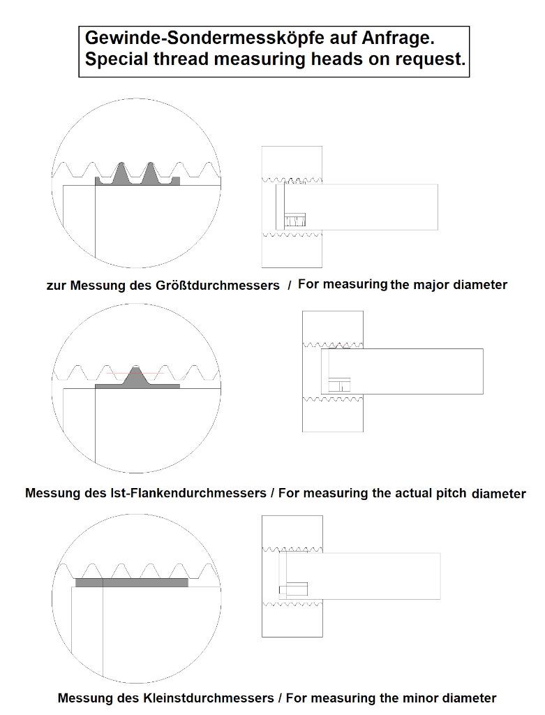 ! In case of inquiry, please indicate if you want to measure major, minor or actual pitch diameter. See sketches regarding special thread measuring heads above. Alternatively, you can also send us a workpiece drawing.