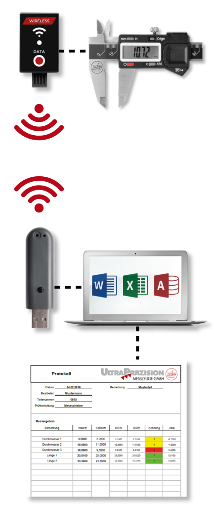 - The data transmission to MS Office (Word, Excel etc.) starts immediately after pressing the data button. In case of more then one sender the measuring results are distinguishable through different sender numbers.
