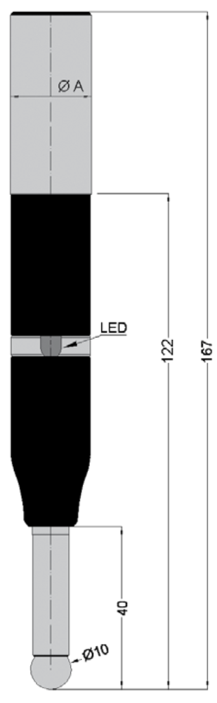 - horizontal und vertikal einsetzbar bei Kontakt der federnden Tastkugel mit dem Werkstück, leuchtet die LED