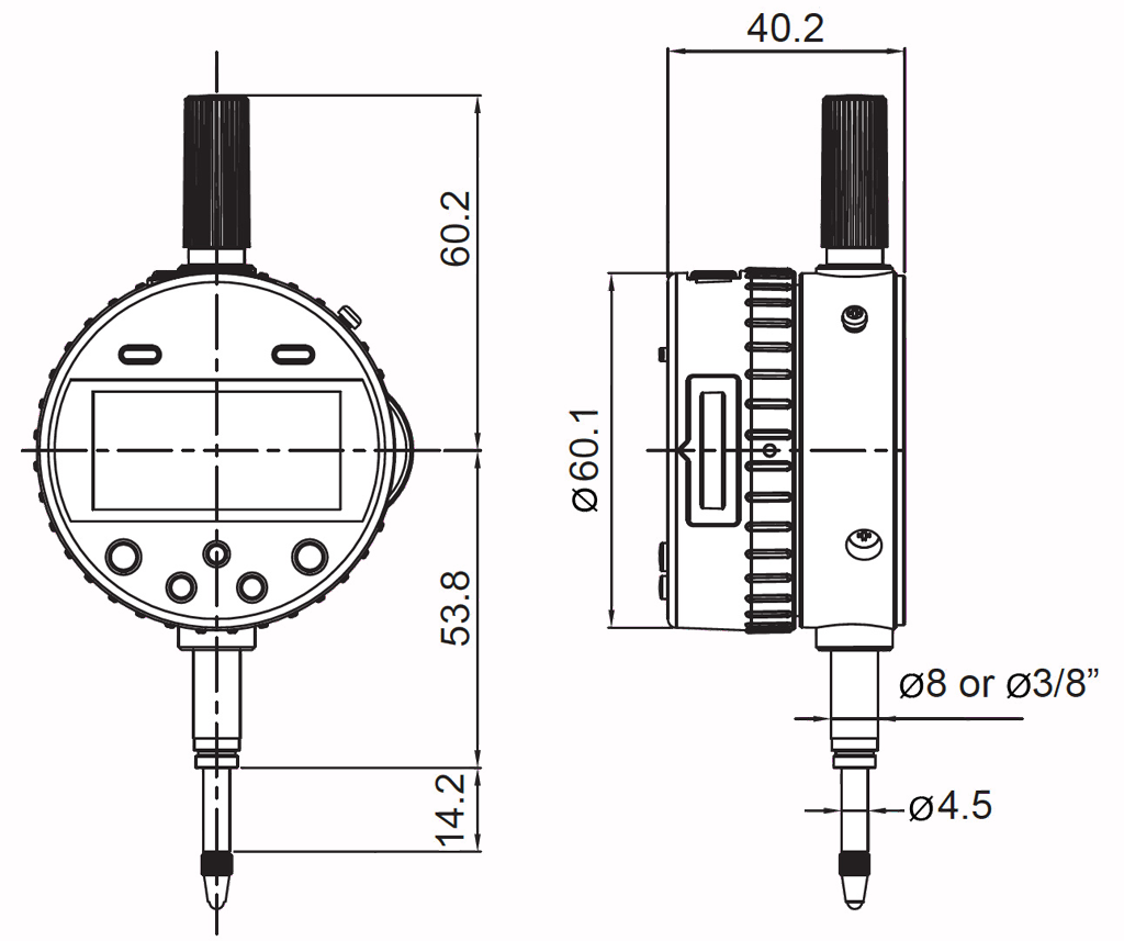- Ein/Aus, mm/inch Umschaltung, 0-Punkt an jeder Position, Toleranzvorwahl, ABS-Funktion, Messrichtungsumkehr, Datenausgang DIGIMATIC