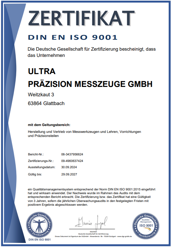 Unser Qualitätsmanagementsystem für die Herstellung und den Vertrieb von Messwerkzeugen und Lehren, Vorrichtungen und Präzisionsteilen entspricht den strengen Vorschriften der DIN EN ISO 9001:2015.