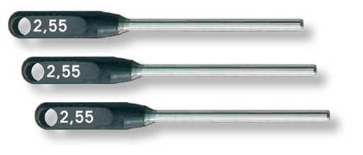 - Griffe mit Bohrung (Öse) und Durchmesserbeschriftung zum Befestigen an der Längenmessmaschine