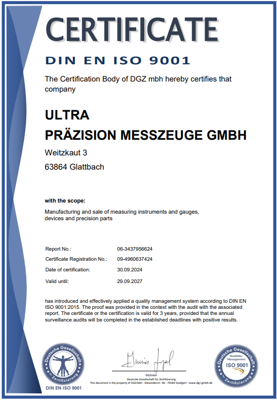 Our Quality Management System for the production and the marketing of measuring tools, gauges, devices and precision parts complies with the strict provisions of DIN EN ISO 9001:2015.